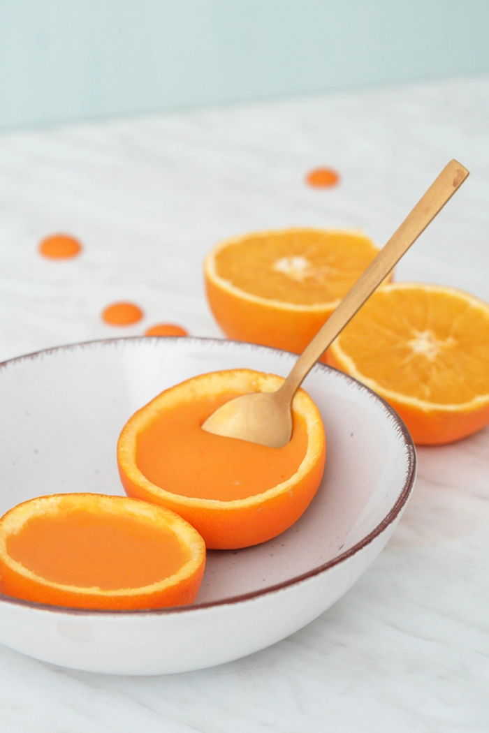 Azúcar, manteca de cacao, leche entera en polvo, emulgente: lecitina de soja, aroma de naranja, colorante: E160e, aroma de vainilla.