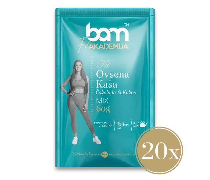 FIT Desayuno, Chocolate y Coco, contiene 20 piezas de Harina de Avena BAM con sabor a chocolate y coco. La Harina de Avena BAM con Chocolate y Coco (60 g) es una excelente comida proteica que aporta proteínas esenciales para mantener una vida activa. Disfrute de esta harina de avena con sabor a chocolate y coco para un desayuno abundante, una comida vigorizante después del entrenamiento o un sabroso tentempié a mediodía.