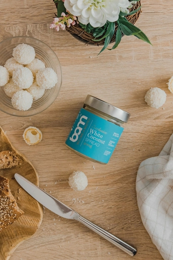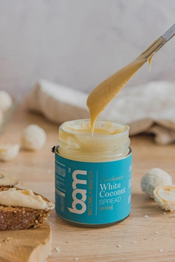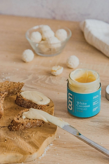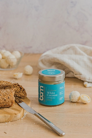 Lapasta para untar de coco BAM White (200 g) contiene al menos un 29% de pasta de almendra y al menos un 14% de pasta de coco. La combinación justa de pasta de almendra y de coco y leche cremosa crea una pasta blanca para untar perfectamente excelente y cremosa. La pasta para untar puede incorporarse maravillosamente a nuestro menú diario y enriquecer nuestros desayunos, meriendas, cenas y postres, ya que tiene un divino sabor a coco y almendras. La pasta para untar no contiene aceite de palma, no está modificada genéticamente y no contiene gluten, por lo que puede ser utilizada por cualquier persona que evite el gluten. La pasta de coco para untar BAM White es ideal para preparar postres, cremas y mousses de gran calidad. Puede añadirse como relleno a croissants, tartas y otros pasteles, o simplemente puede untarse en pan, tortitas o añadirse a helados y frutas.