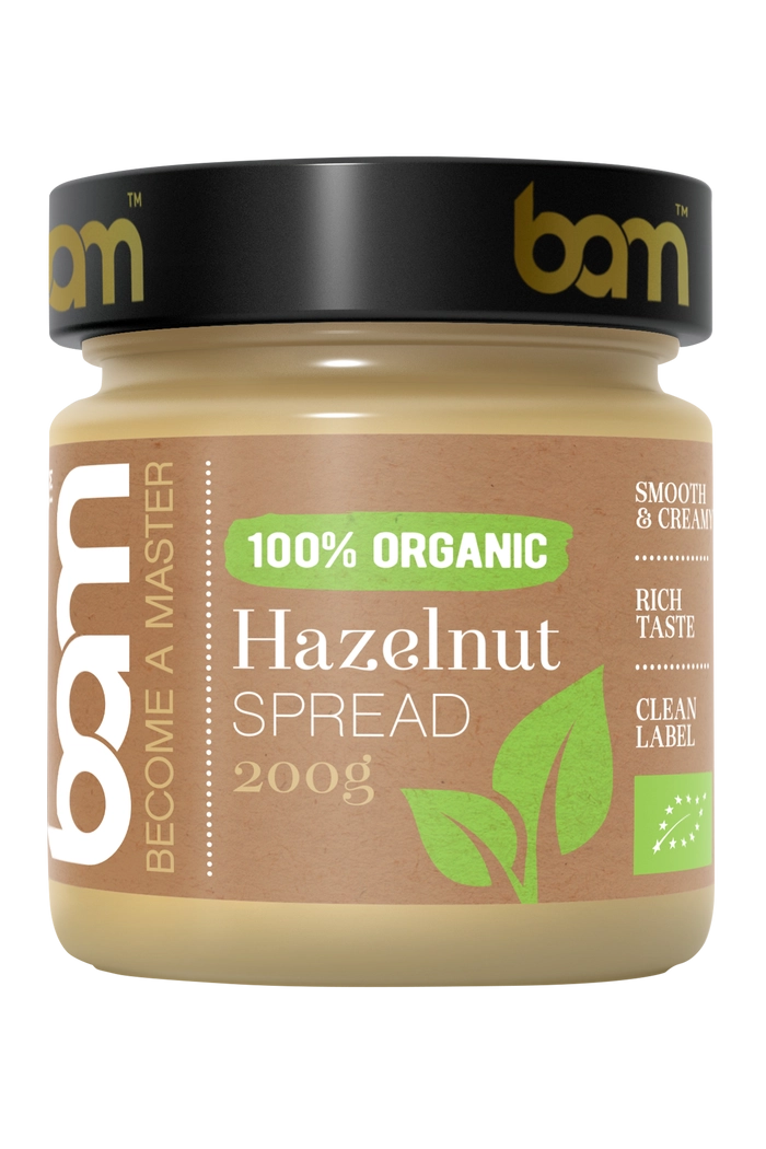 BAM 100% Organic Hazelnut Spread (200 g) está hecho para los verdaderos amantes de los frutos secos. El ingrediente principal son las avellanas de cultivo ecológico, que se preparan mediante un suave proceso de tostado para desarrollar todo su sabor natural. La pasta para untar no contiene aditivos, ni sal, ni azúcar, ni emulgentes, y sólo contiene los aceites y azúcares naturales de las avellanas.