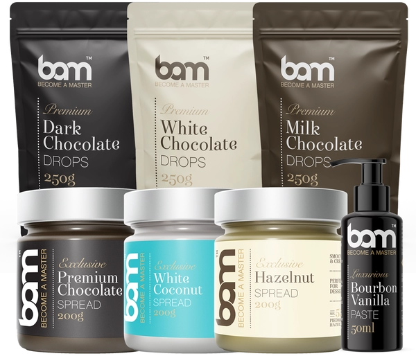 El set de confitería Cakepops & popsicles contiene pasta para untar BAM, pasta de vainilla BAM y chocolate blanco, negro y con leche BAM. El set contiene los productos que utiliza la pastelera Kimi Zupančič para elaborar los populares cakepops y polos. Ella utiliza la pasta de vainilla BAM para realzar el sabor de la base, las cremas para untar BAM como relleno de los pasteles y los chocolates BAM para recubrir los cakepops y los polos. Los productos del set de repostería Cakepops & Popsicles son adecuados tanto para los que ya crean a partir de las recetas de un artista de la repostería como para los que acaban de empezar. Los productos del set no contienen GLUTEN.