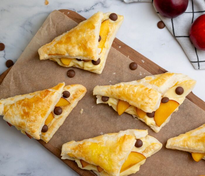 Para esta receta utilizaremos hojaldre, conocido por su textura ligera y crujiente. Cortaremos el hojaldre en cuadrados, los rellenaremos con crema de vainilla hecha con leche y mezcla de crema de vainilla BAM y añadiremos nectarinas frescas cortadas en rodajas. Para poner la guinda al pastel, los bolsillos se espolvorearán con chocolate con leche BAM para añadir un extra de dulzor y sabor a chocolate.
