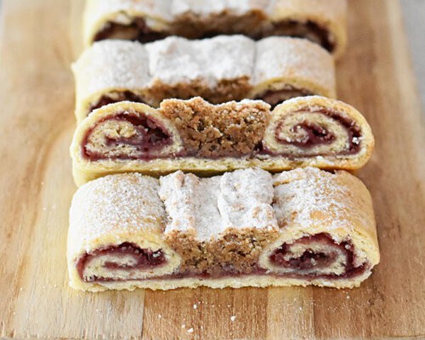 El bigote del abuelo es un pastel estupendo con un nombre gracioso, porque a primera vista, debido a su forma, se parece realmente a un bigote. El pastel se compone de masa de levadura, mermelada y un relleno de nueces con claras de huevo. Se puede utilizar cualquier mermelada; en esta ocasión he optado por una mermelada de guindas, que ha quedado estupenda. Para el relleno, las nueces pueden sustituirse por semillas de amapola, avellanas o cacao. El pastel es fácil de preparar, y habrá más que suficiente para todos. La receta rinde para dos "panes" y un molde de 34 x 20 cm. Si quieres que sea más grande, duplica los ingredientes y utiliza un molde más grande.