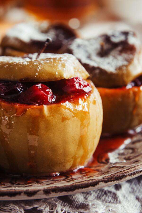 Sacar las manzanas del horno y, si se desea, rociar el exterior de las manzanas con el zumo de la bandeja de horno. Esto añade un poco de humedad a la piel.