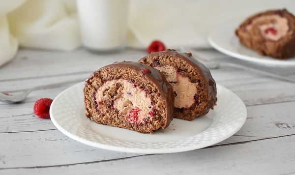 Desenrollar la masa y despegar el papel de horno (sobre el que se ha horneado el bizcocho). Cubrir completamente el bizcocho con mermelada de frambuesa; verter la crema de chocolate sobre la mermelada y extenderla uniformemente con una espátula, dejando 5 cm de borde sin cubrir (de lo contrario, la crema se saldrá al final cuando se enrolle). Presionar las frambuesas frescas sobre la crema en el borde de la masa donde se va a enrollar el rollo y enrollar la masa firmemente formando un rollo utilizando el papel de horno que hay debajo. Envolver el rollo en papel film y meterlo en el frigorífico para que se enfríe y se endurezca.