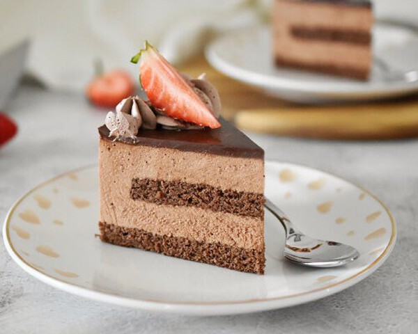 Mientras se enfría el bizcocho, preparar el relleno de chocolate. Derretir al baño maría el cho- colate y 100 g de nata para montar, montar el resto de la nata (250 g) y refrigerar. Remojar las hojas de gelatina en agua fría durante al menos 5 minutos. Disolver la gelatina escurrida en el chocolate fundido y añadir el puré de fresa y el extracto de fresa. Remover con una espátula para combinar los ingredientes, retirar del vapor y enfriar hasta que esté tibio. Incorporar la nata montada al chocolate templado con una espátula.