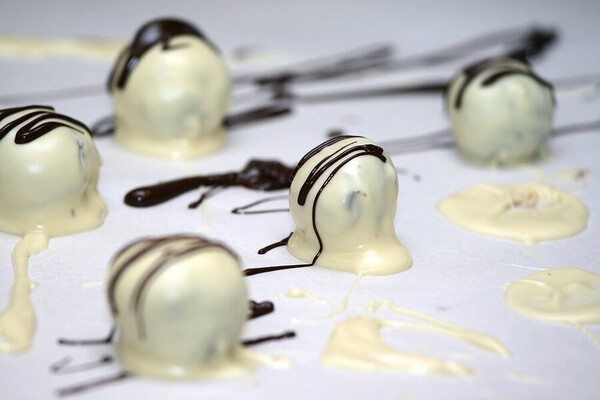 Fundir el chocolate blanco al baño maría, listo para decorar la cobertura. Una vez que el chocolate negro se haya endurecido, extienda el chocolate blanco en finas líneas sobre las trufas.